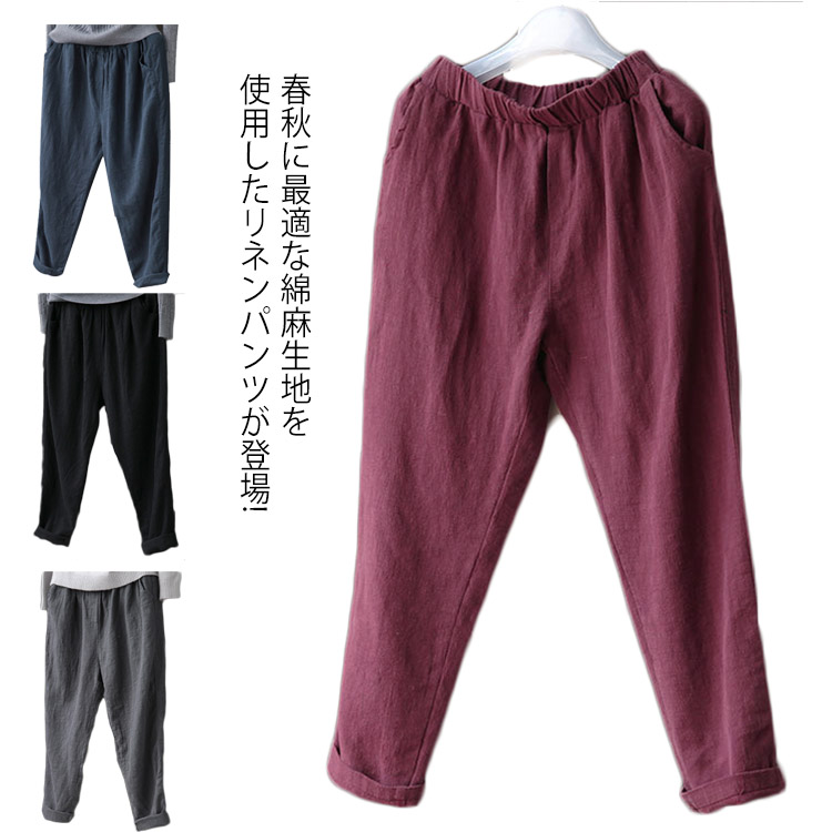 送料無料 テーパードパンツ レディース 9分丈 綿麻 サルエル ロングパンツ ハロンパンツ ボトムス 無地 体型カバー シンプル 着痩せ ゆったり ウエストゴム リネン