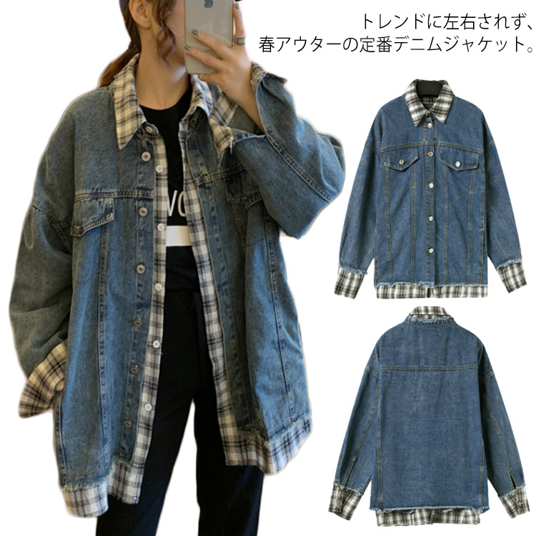 送料無料 ジャケット デニムジャケット レディース デニムコート ゆったり フェイク レイヤード アウター 女性用 春秋物 新作 ジーンズ カジュアル お洒落 チェック