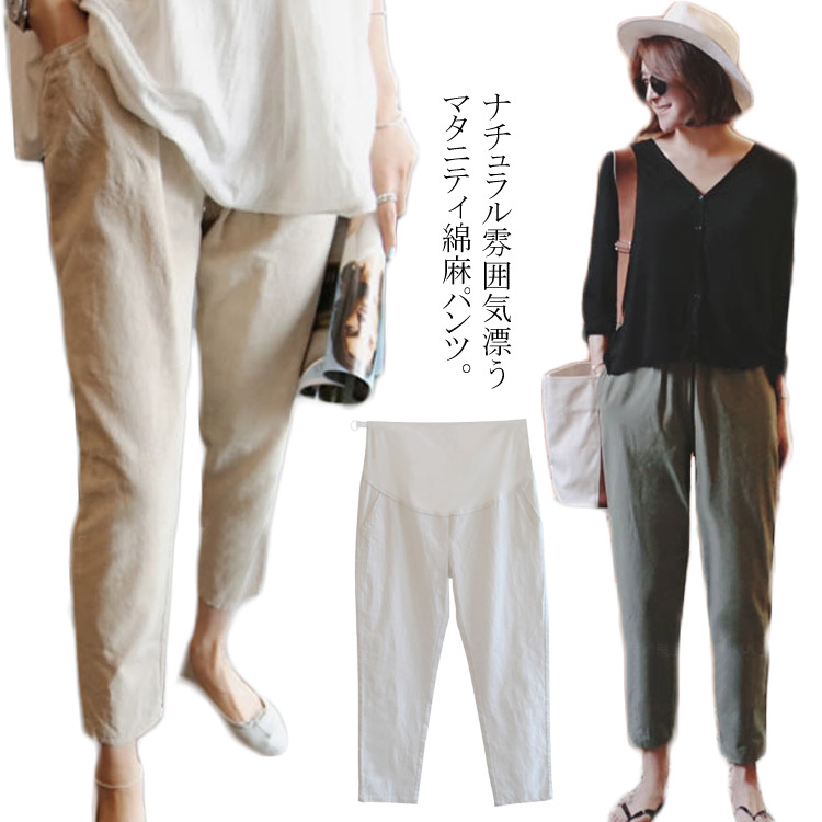 マタニティ 綿麻パンツ リネンパンツ サルエル 妊娠服 妊娠 マタニティパンツ 春 夏 秋 無地 アンクル 9分丈 マタニティウェア ボトムス カジュアル アジャスター付き