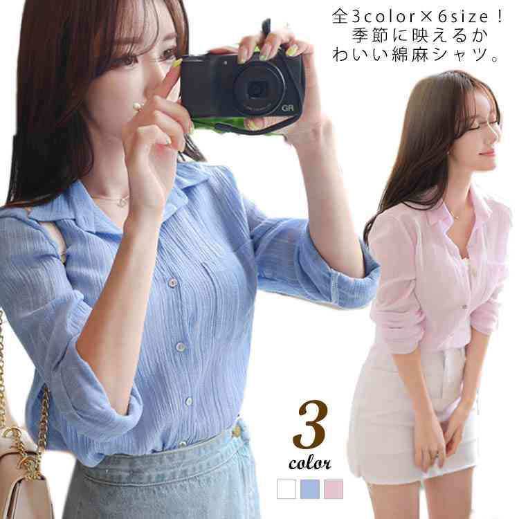《送料無料》S-3XL×3カラー!シャツ レディース 綿麻 トップス 長袖シャツ ブラウス ベーシック シンプル 無地 薄手 春 夏 大きサイズ 通勤 袖ロールアップ可