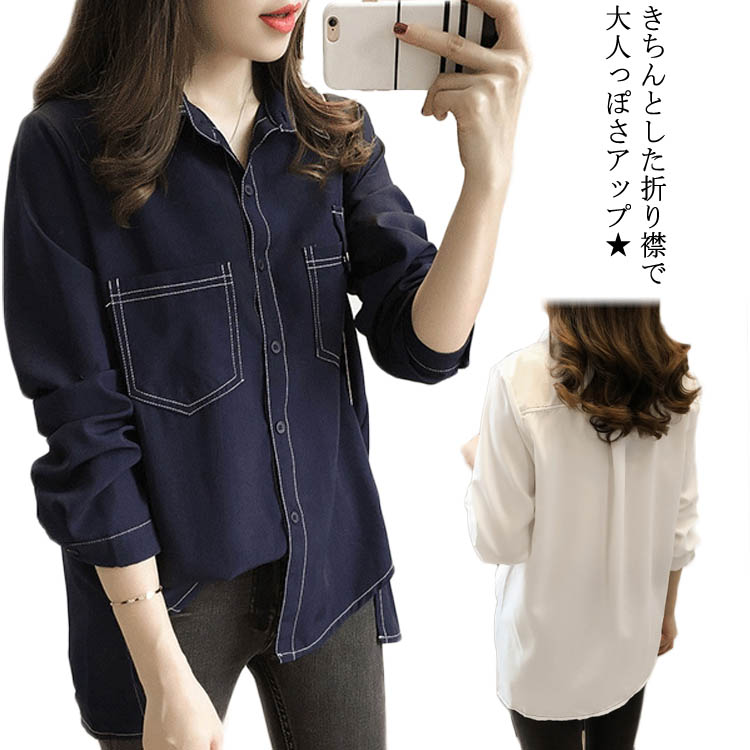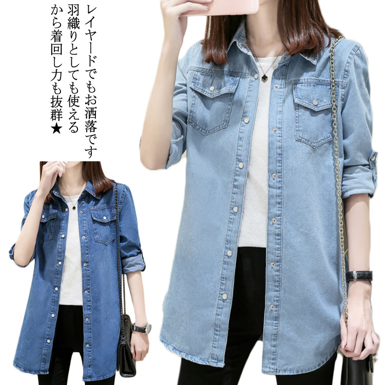 送料無料 ブラウス デニム レディース デニムシャツ デニムブラウス 長袖 折り襟 丸襟 ボタン付き ポケット付き 無地 カジュアル キレイめ お洒落 ゆったり 重ね着 レイヤード 春秋 前開き 秋新作