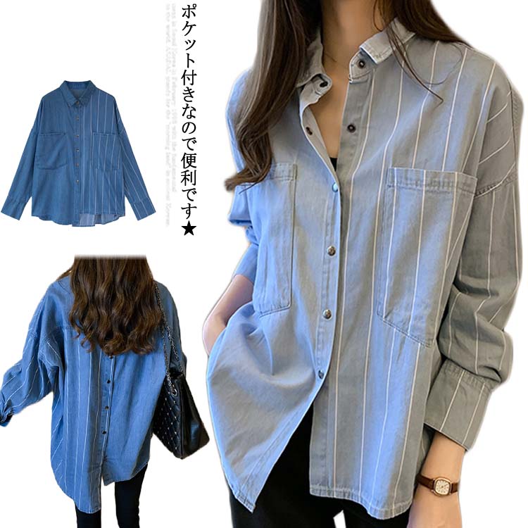 送料無料 デニムシャツ レディース シャツブラウス 長袖シャツ カジュアルシャツ 無地シャツ ロングシャツ ストライプシャツ 切り替え ライトアウター ルーズ ゆったり トレンド お洒落 かわいい 秋新作
