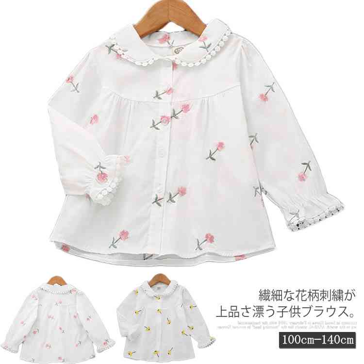 送料無料 花柄刺繍が可愛い 長袖ブラウス 女の子 長袖シャツ シャツ 子供トップス キッズ 刺繍 丸襟 レース フレア 超可愛い 2019秋新作