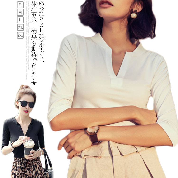 送料無料 Tシャツ/レディース/五分袖Tシャツ/カットソー/無地/薄手/Vネック/ゆったり/とろみTシャツ/プルオーバー/トップス/お洒落/シンプル/カジュアル/オールシーズン/夏新作