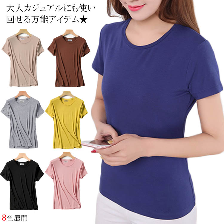 送料無料 Tシャツ レディース 半袖Tシャツ ラウンドネック 鎖骨見せ 無地 定番 万能アイテム シンプル キレイめ お洒落 春夏 トップス 新作