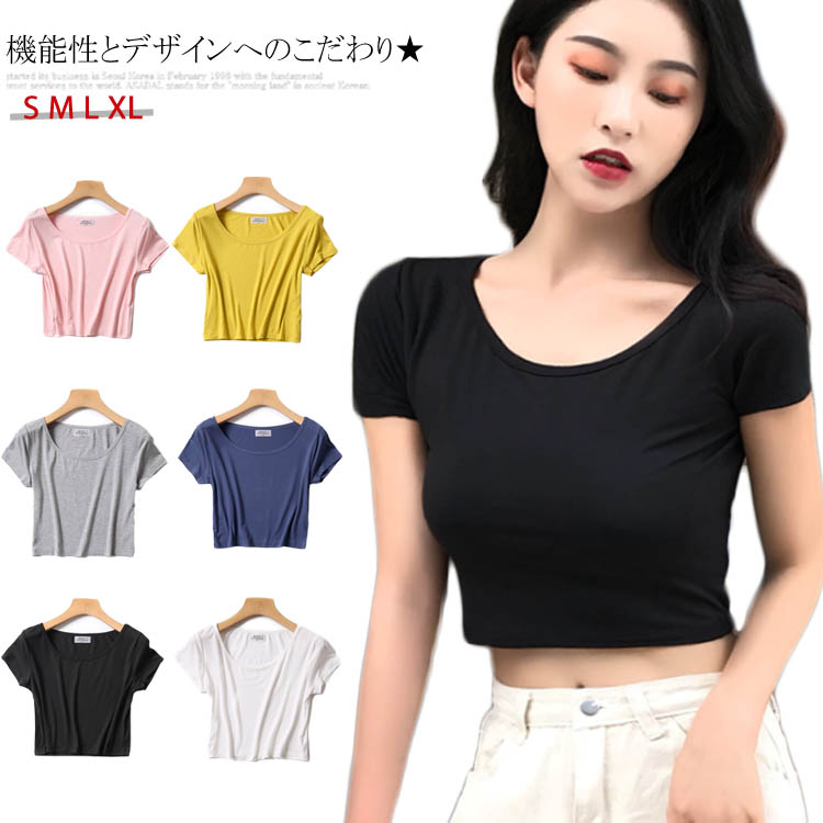 送料無料 Tシャツ レディース 半袖Tシャツ へそだし ラウンドネック ストレッチ 伸縮性 ショート丈 ショートTシャツ トップス プルオーバー お洒落 カジュアル シンプル リラックス 夏物 新作