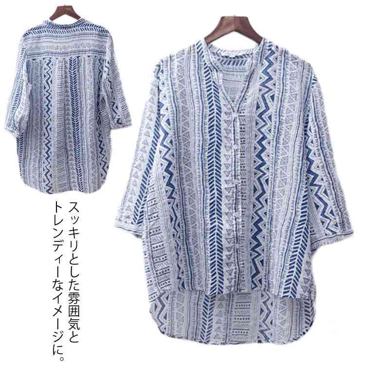送料無料 シャツ ブラウス 7分袖 着痩せ Vネック プリント 薄手 透け感 綿麻シャツ トップス シンプル レディース ゆったり カジュアル お洒落