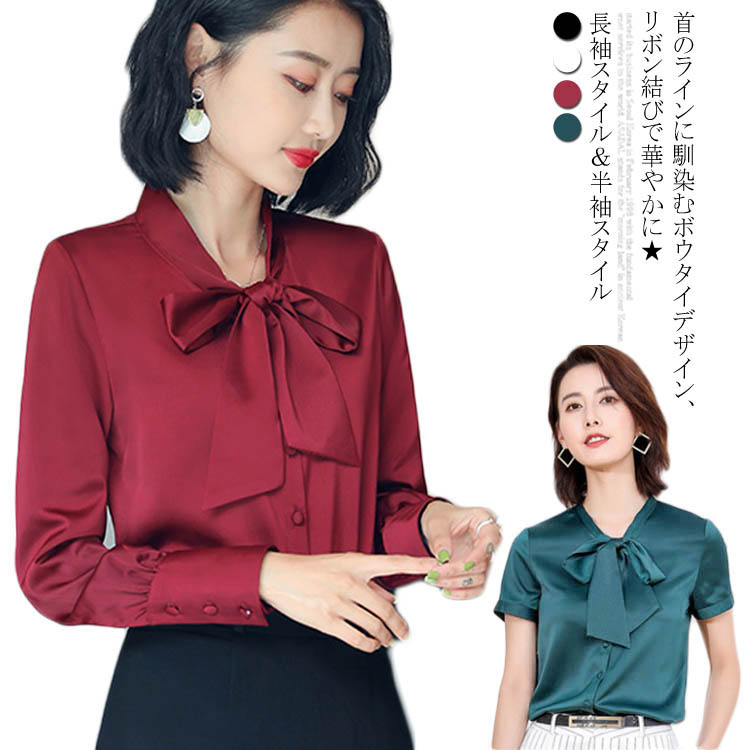 送料無料 ブラウス レディース シフォンブラウス シャツブラウス 半袖シャツ 長袖シャツ ボウタイ 無地シャツ 無地ブラウス リボン シンプル 定番 キレイめ こなれ感 大人 お仕事 通勤 オフィス トップス 前開き 春物 夏物 春新作