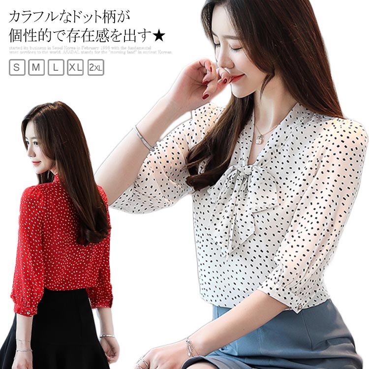 送料無料 シフォンブラウス レディース シャツブラウス 七分袖ブラウス ドット柄 ボウタイ カジュアルブラウス トップス リボン付き カラーバリ お洒落 通勤 上品 大人可愛い エレガント シンプル 夏新作