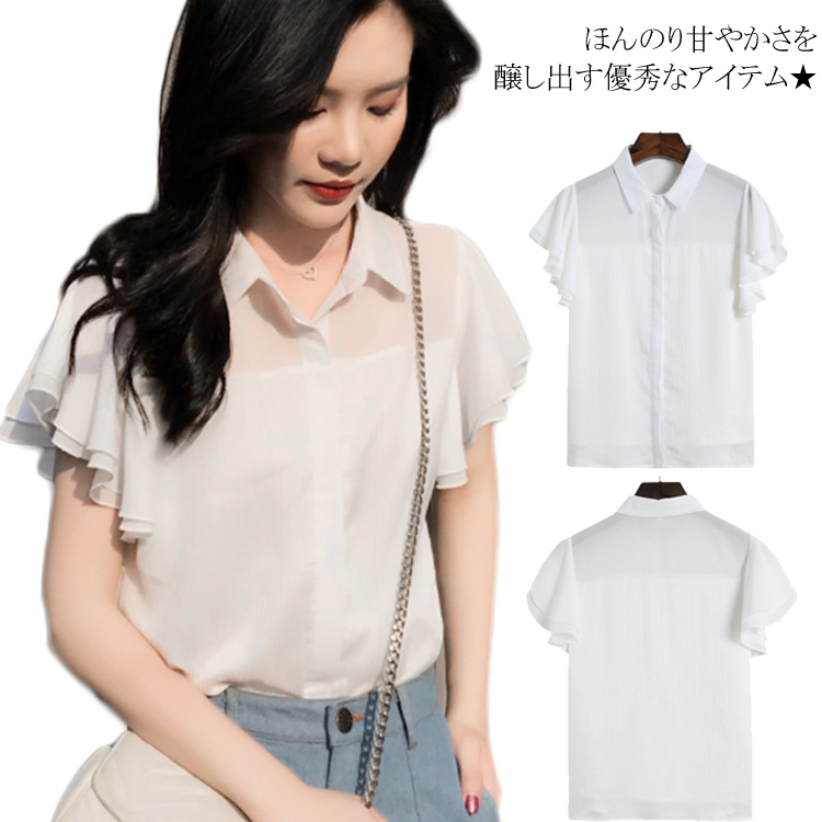 送料無料 シャツブラウス/レディース/シフォンブラウス/半袖/フリル/フレアスリーブ/無地/通勤/さっぱり/エレガント/シンプル/OL風/可愛い/着痩せ/ファッション/お洒落/シャツ/トップス/夏新作