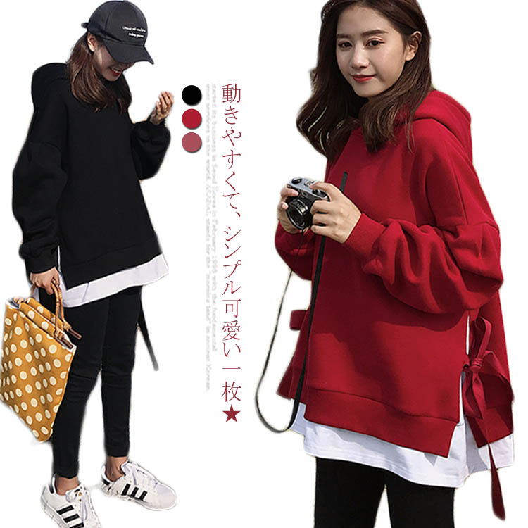 送料無料 パーカー レディース プルパーカー フード付き 長袖 ポケット付き 無地 重ね着 暖かい 厚かパーカー レイヤード かわいい シンプル カジュアル お洒落 体型カバー 普段着 プルオーバー トップス 夏新作