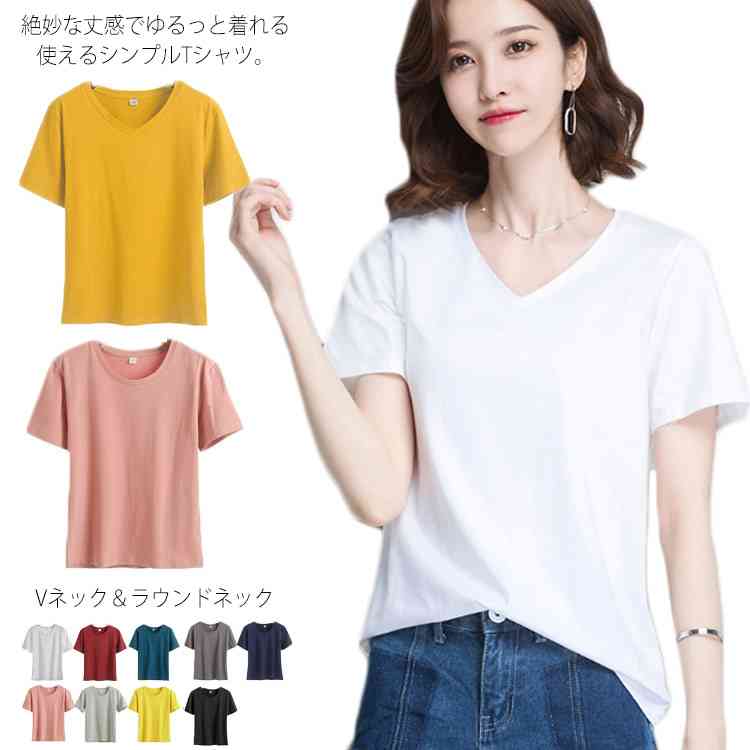 送料無料 2タイプ選べる Tシャツ 半袖 Vネック ラウンドネック コットン 無地 トップス レディース 夏服 大きいサイズ カバー カットソー カラフル 新作 お洒落