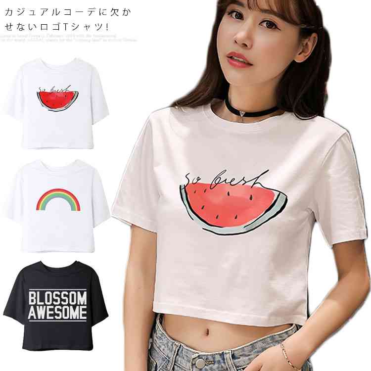 送料無料 Tシャツ 半袖 ラウンドネック コットン プリント トップス レディース 夏服 ショート丈 へそ出し ホワイト シンプル 新作 お洒落 着痩せ