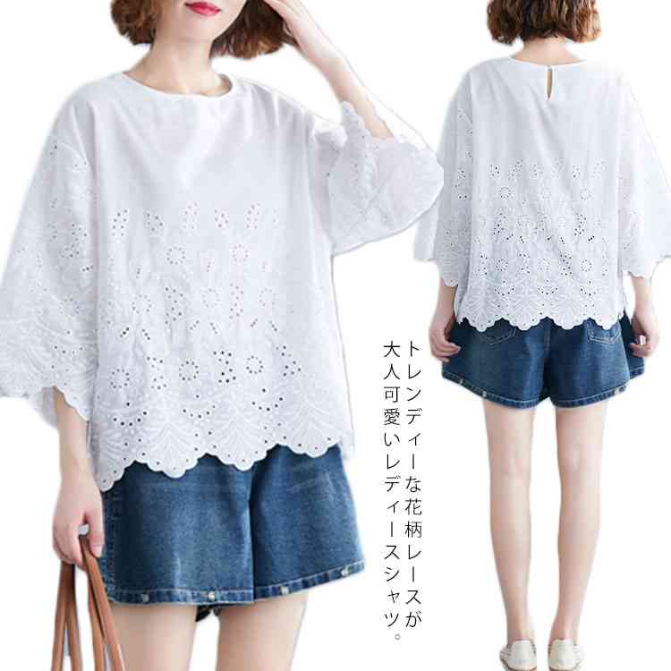 送料無料 シャツ 7分袖 レースシャツ ワイドシャツ トップス 白シャツ ブラウス レディース 大人可愛い 綿麻混 ホワイト 無地 刺繍レース