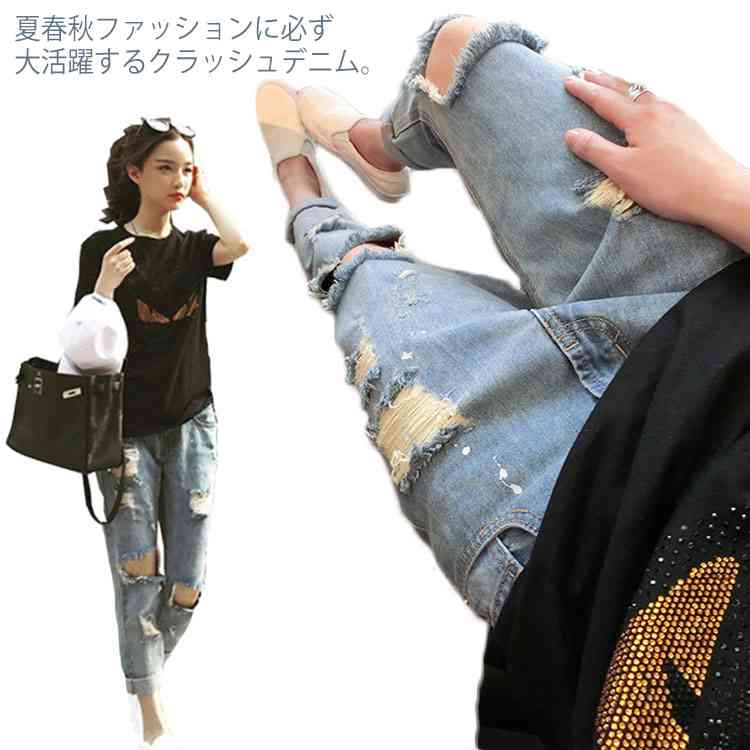 送料無料 デニムパンツ ダメージ ダメージデニム ボトムス レディース 大きいサイズ サルエル 9分丈 大人カジュアル ロールアップ お洒落