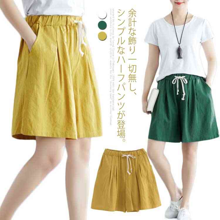 送料無料 ハーフパンツ ワイドパンツ ボトムス レディース 綿麻パンツ ゆったり ウエストゴム ショートパンツ カジュアル お洒落 全3色 夏物