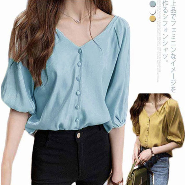 送料無料 シャツ シフォン ブラウス 5分袖 着痩せ Vネック シフォンシャツ 薄手 ボリューム袖 トップス シンプル レディース ゆったり カジュアル お洒落
