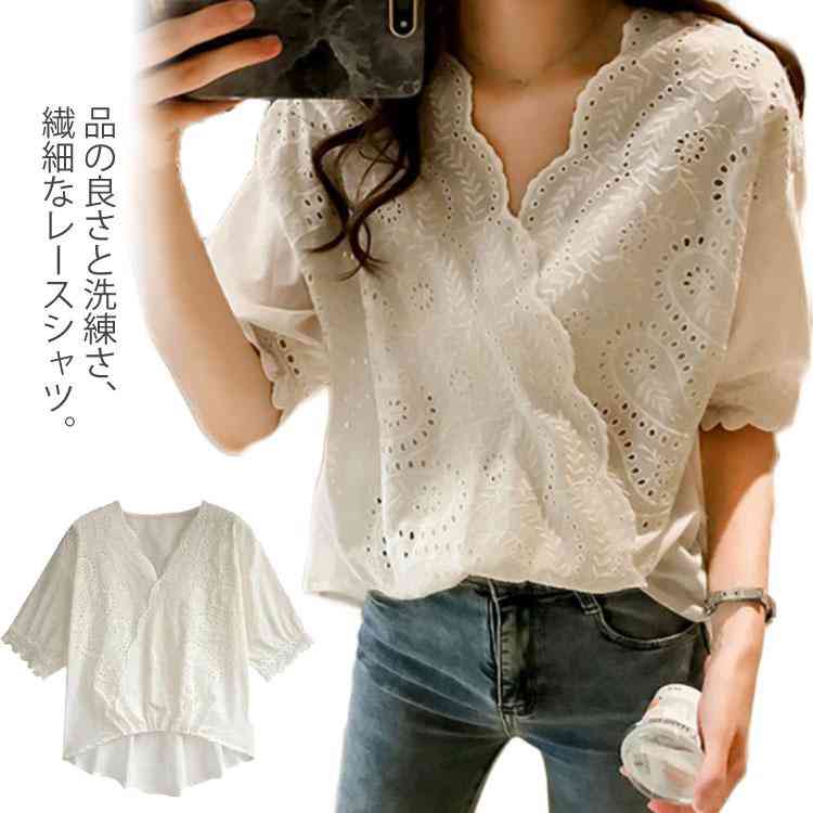 送料無料 シャツ レースシャツ 2019夏の新作 大サイズ 半袖シャツ Vネック トップス ブラウス 夏服 ゆったり 大人可愛 無地 カバー レディース 合わせやすい