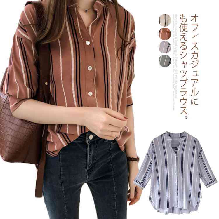 送料無料 シャツ ストライプ 2019夏の新作 大サイズ 7分袖 Vネック トップス ブラウス 夏服 ゆったり お洒落 無地 カバー レディース 体型カバー 全4色