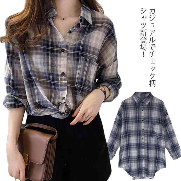 送料無料 シャツ チェック柄 2019夏の新作 大サイズ 長袖 冷房対策 トップス ブラウス 夏服 ゆったり お洒落 UVカット カバー レディース 体型カバー カジュアル