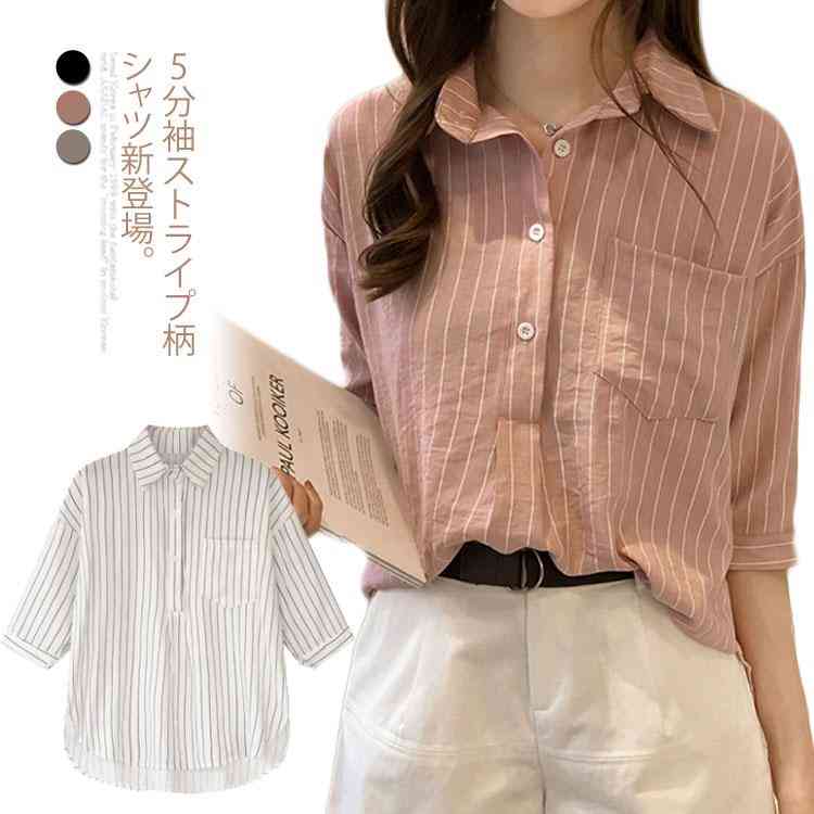 送料無料 シャツ ストライプ 2019夏の新作 大サイズ 5分袖 フェミニン感 トップス ブラウス 夏服 ゆったり お洒落 カバー レディース 体型カバー 全3色
