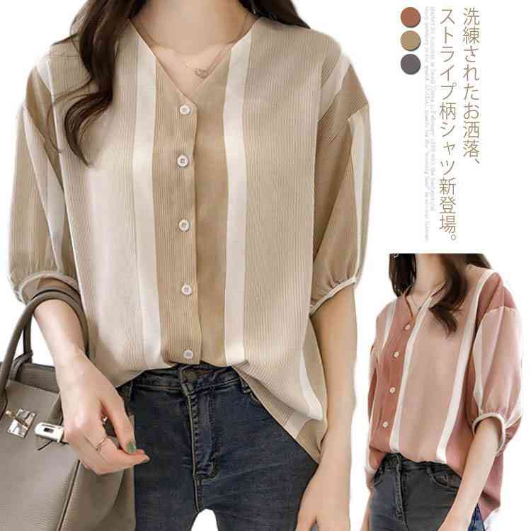 送料無料 シャツ ストライプ 2019夏の新作 大サイズ 5分袖 Vネック ボリューム袖 トップス ブラウス 夏服 ゆったり 大人女子 着痩せ カバー レディース エレガント 体型カバー