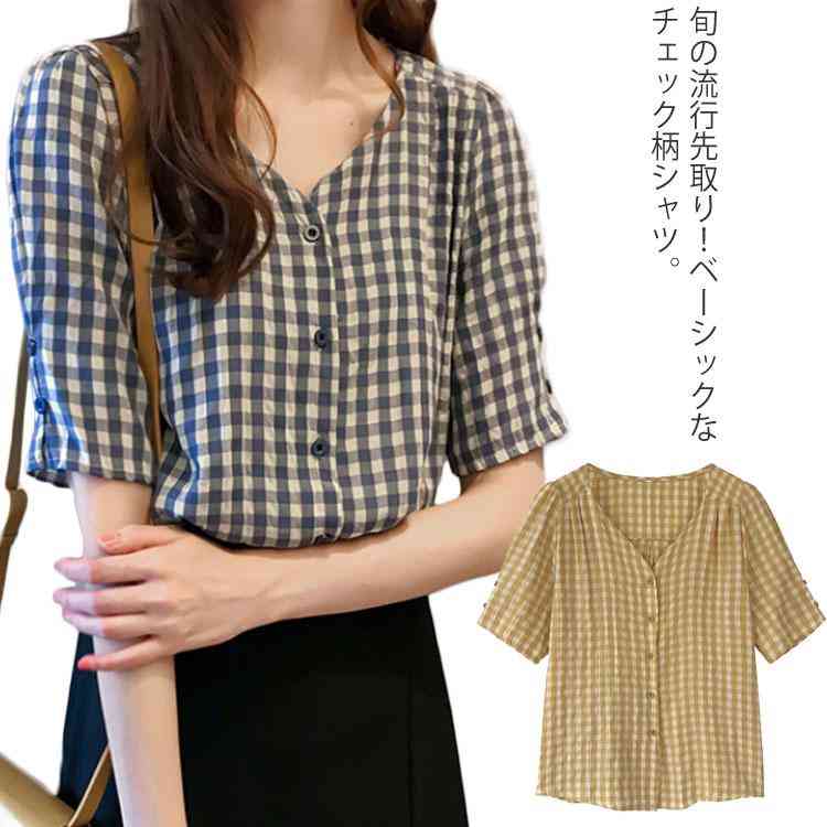 送料無料 シャツ チェック柄 2019夏の新作 大サイズ 5分袖 Vネック トップス ブラウス 夏服 ゆったり 大人女子 着痩せ カバー レディース エレガント 体型カバー