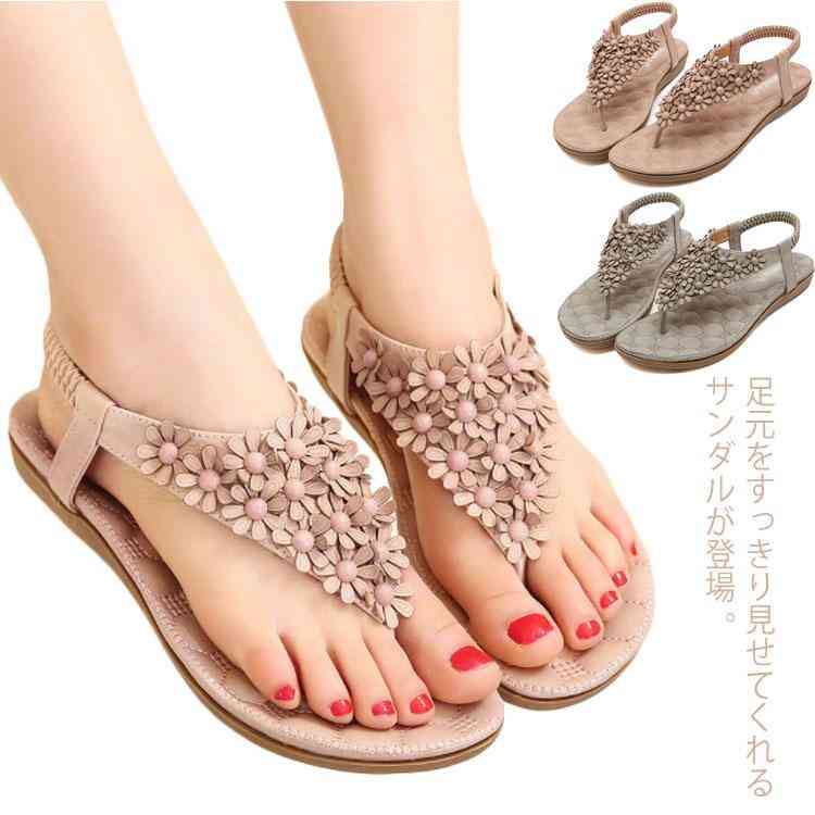 送料無料 サンダル ビーチサンダル レディース シューズ 歩きやすい 疲れにくい 大きいサイズ べったん 花飾り 可愛い ローヒール ファッション 美脚