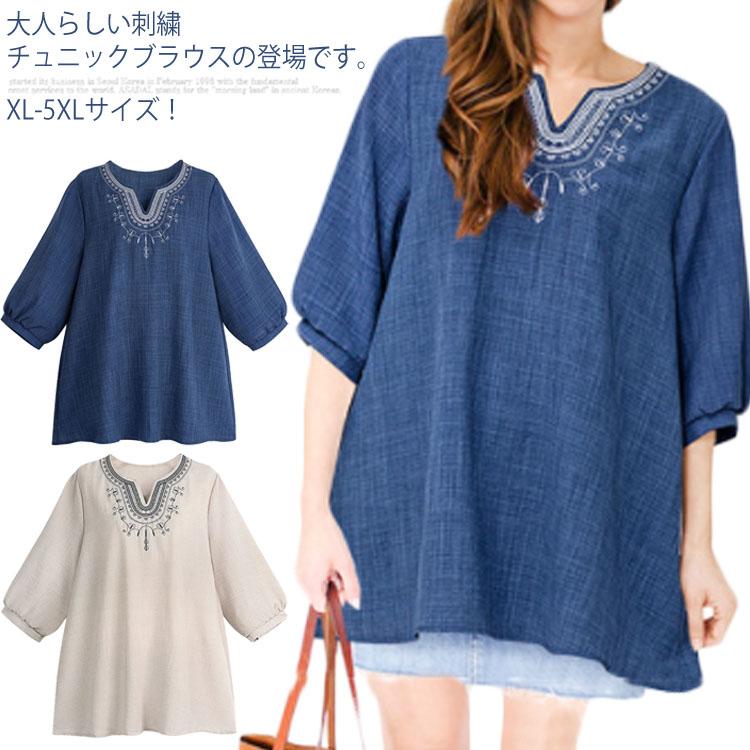 《送料無料》XL-5XLサイズ!刺繍チュニックブラウス チュニック レディース 五分袖 七分袖 刺繍 エスニック トップス ブラウス 春 夏 おしゃれ 可愛い カジュアル ナチュラル ベージュ ネービー