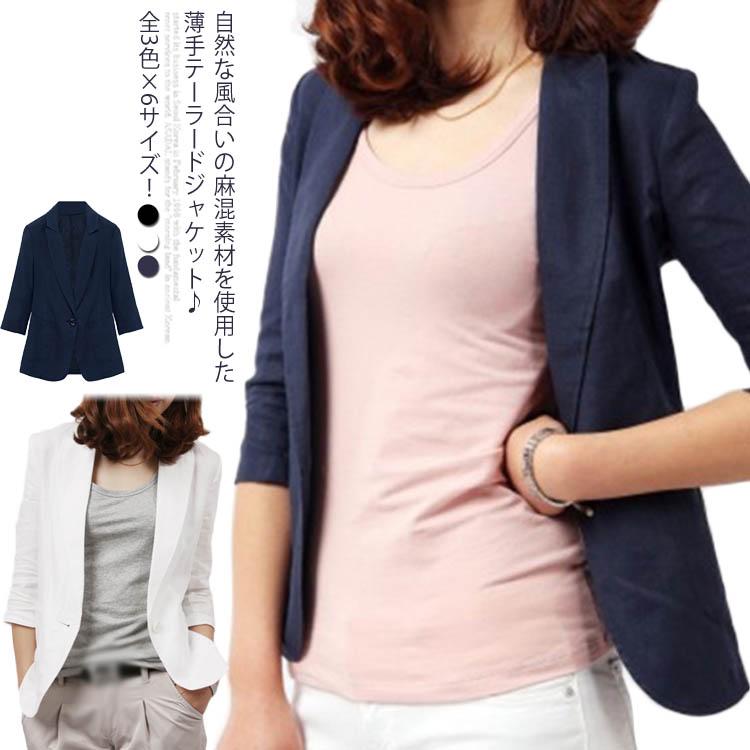《送料無料》全3色×6サイズ!麻混 七分袖 テーラードジャケット リネンジャケット 七分袖ジャケット 綿麻 麻 亜麻 無地 ナチュラル 大きサイズ 薄手 春服 夏服 秋服