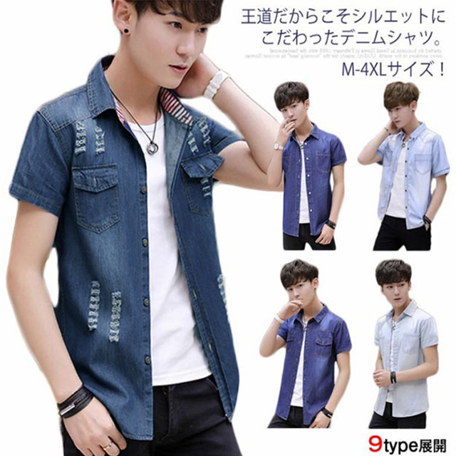 《送料無料》M-4XLサイズ!夏服 デニムシャツ メンズ シャツ 半袖 トップス 半袖シャツ デニムブラウス ウォッシュ加工 スリム ダメージ加工 通勤 通学 カジュアル 薄手