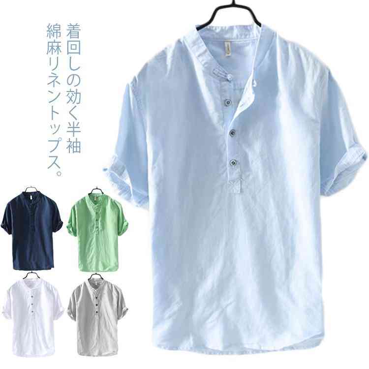 《送料無料》全6色×7サイズ!シャツ メンズ 綿麻 半袖シャツ リネンシャツ 半袖 無地シャツ 立ち襟 ブラウス トップス 麻 リネン シンプル 無地 春 夏