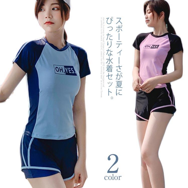 送料無料 水着 セットアップ レディース フィットネス ショートパンツ Tシャツ 2点セット お洒落 体型カバー 大きいサイズ 大人可愛い パッド付 大人女子 スポーツ水着