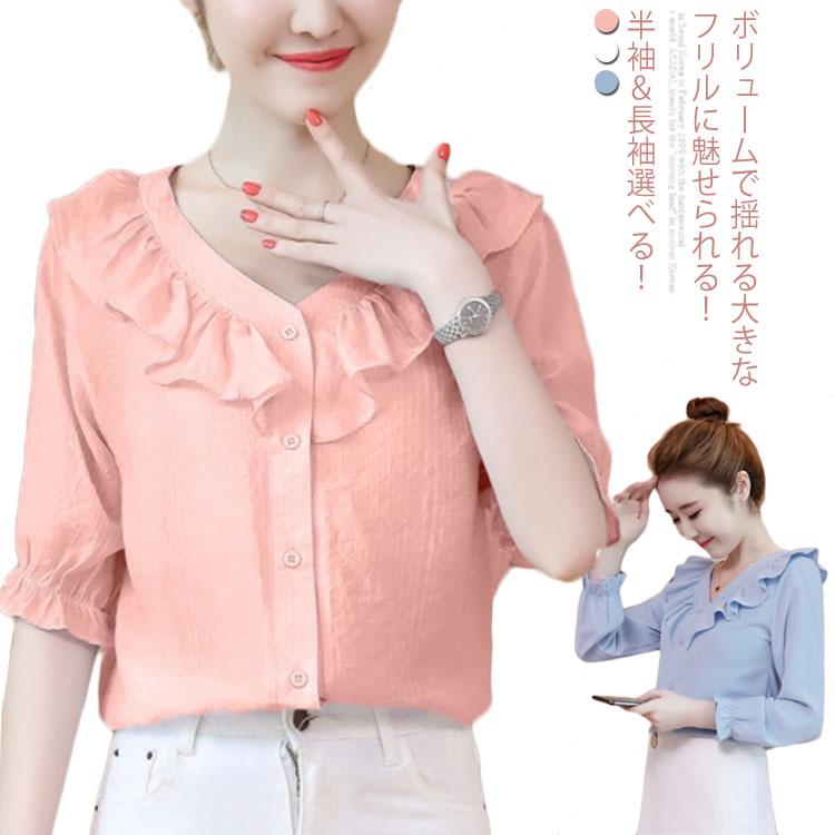 《送料無料》【長袖/半袖 S-XXLサイズ!】フリルブラウス レディース シャツ ブラウス フリル トップス 半袖 夏 おしゃれ 可愛い
