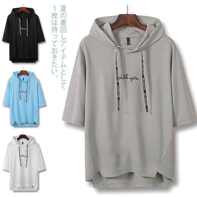 送料無料 Tシャツ 吸汗速乾 メンズ 5分丈 プルオーバー 全4色 フード付き トップス 冷感加工 ゆったり 大きいサイズ 薄手