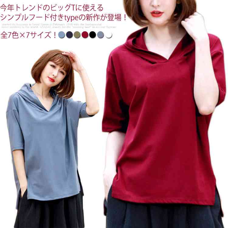 《送料無料》全7色×7サイズ!ビッグシルエットがこなれた感up!フード付きロングT ビッグT レディース tシャツ フード付き 半袖Tシャツ オーバーサイズ 大きサイズ スリット ゆったり 可愛い 無地 春 夏