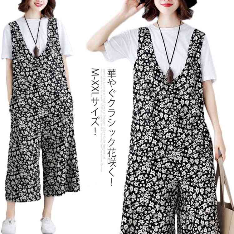《送料無料》華やぐクラシック花咲く!サロペット オールインワン ワイドパンツ 七分袖 ボトムス オールインワンワイドパンツ 花柄サロペット 総柄 プリント 春 夏 美脚 ワイド