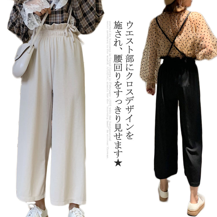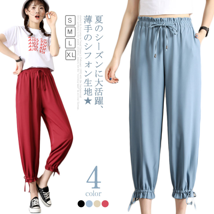 送料無料 シフォンパンツ レディース 九分丈パンツ 無地パンツ ロングパンツ ゆるパンツ 薄手パンツ ウエストゴム入り リボン付き 裾絞り ポケット付き シャーリング裾 ハイウエスト キレイめ カジュアル リラックス お洒落 ボトムス 夏物 夏新作