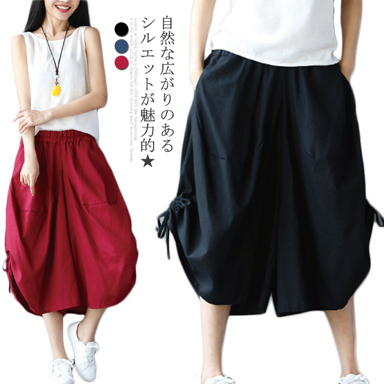 送料無料 ガウチョパンツ レディース ワイドパンツ フレアパンツ 七分丈パンツ ゆるパンツ 無地パンツ ポケット付き ボタン付き ハイウエスト ゴム入り ゆったり リラックス カジュアル キレイめ お洒落 体型カバー 着痩せ ボトムス 春物 夏物 夏新作