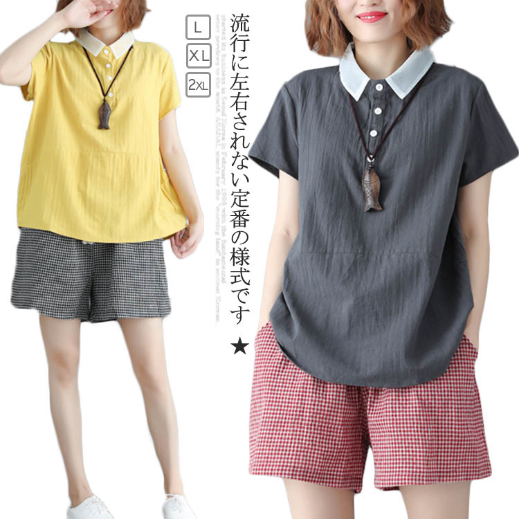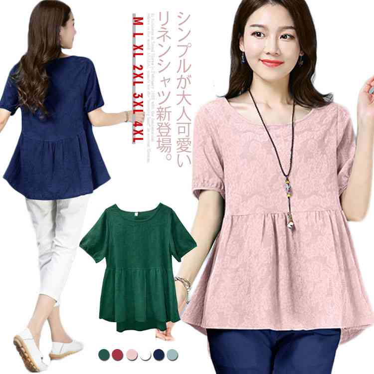 【6色展開】送料無料 シャツ ブラウス 麻綿 トップス 半袖 レディース リネン ラウンドネック 大きいサイズ 体型カバー シンプル 無地 リネントップス