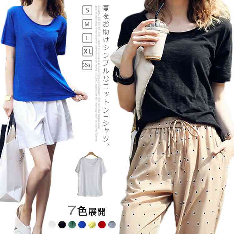 Tシャツ カットソー ラウンドネック トップス レディース ゆったり シンプル 無地 半袖 夏服 コットン 夏物