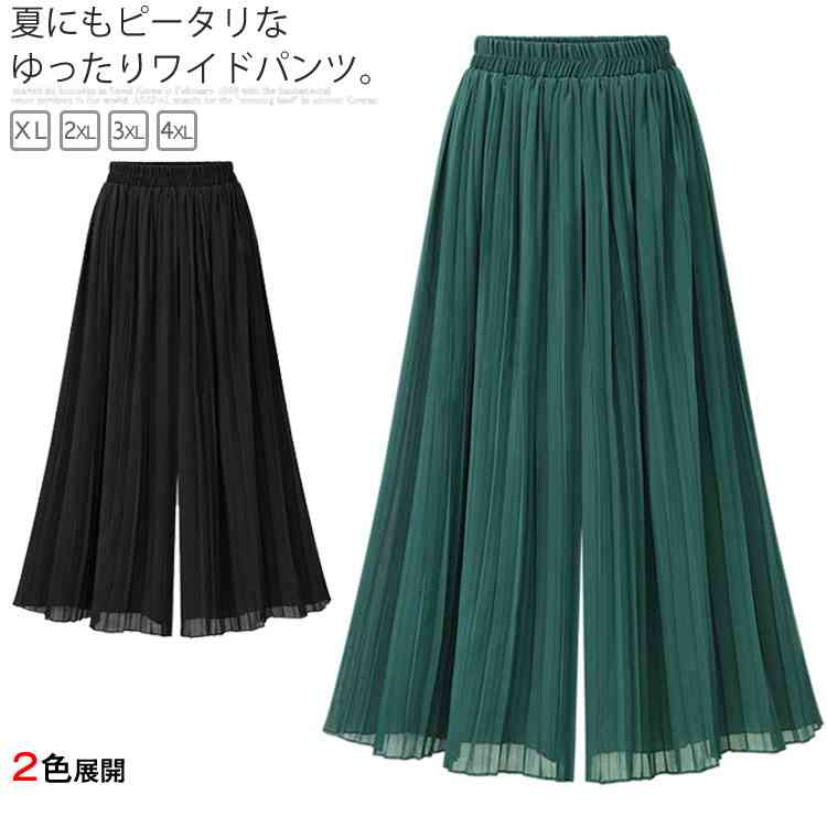 【XL-4XL】ワイドパンツ シフォンパンツ ボトムス レディース ロングパンツ プリーツパンツ ゆったり 大きいサイズ 体型カバー 夏服 シフォン グリーン ブラック