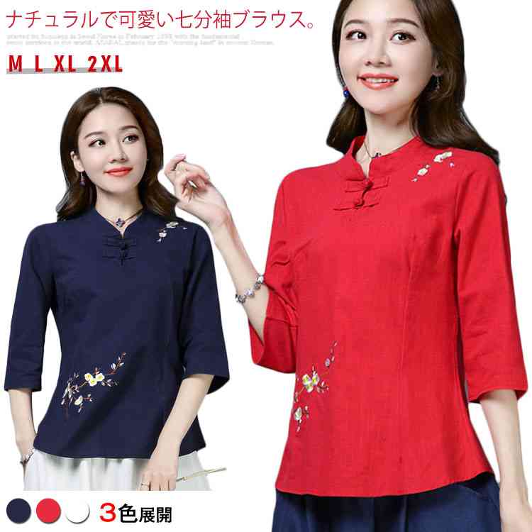 シンプルなのにお洒落。リネンブラウス レディース シャツ ブラウス トップス 七分袖 五分袖 リネントップス 刺繍入り 花柄刺繍 ショート丈 春 夏