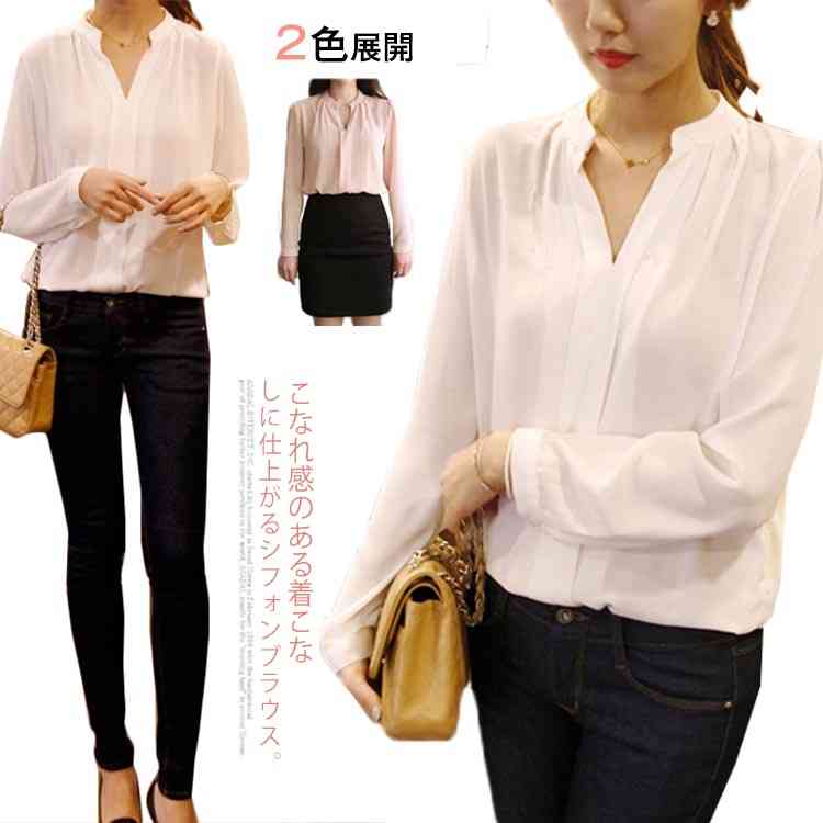 スキッパーシャツ レディース プルオーバー トップス シャツ ブラウス シフォン 長袖 Vネック 薄手 春 夏 春服 シンプル 無地 通勤 オフィス