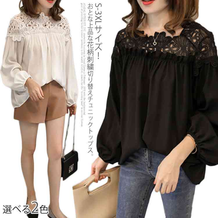 S-3XLサイズ!レース切り替え トップス チュニック プルオーバー シフォンブラウス 春服 夏服 長袖 大きサイズ レース 刺繍 フェミニン 体型カバー ホワイト ブラック