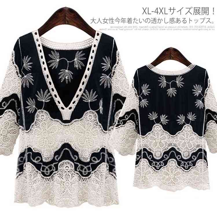 [大きサイズ LL-5L]春夏新作 vネック レーストップス vネックブラウス レディース シャツ ブラウス レース トップス tシャツ 刺繍入り 夏物 七分袖 透かし 透け感 キレイめ レディースファッション