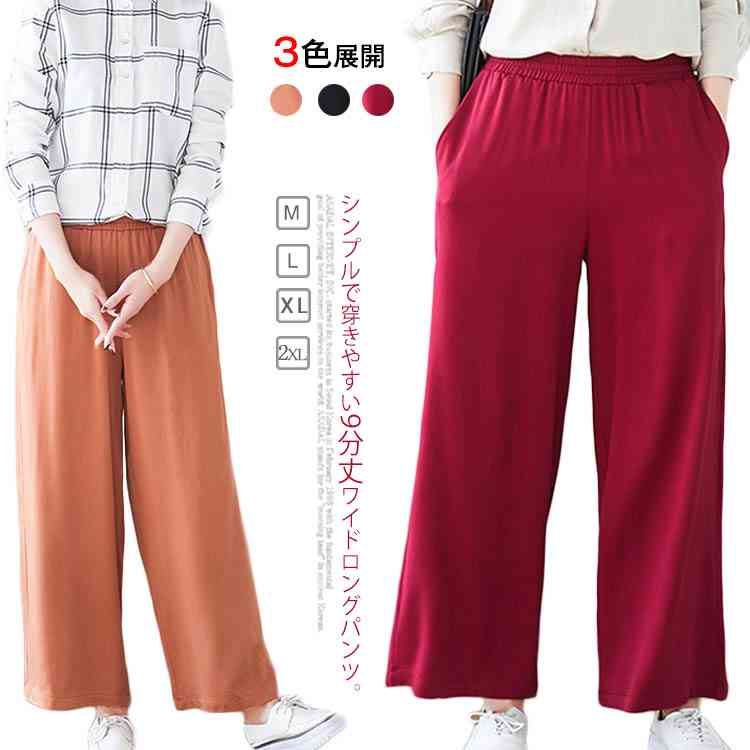 柔らかく肌触り抜群のコットン地。ワイドパンツ 9分丈 ガウチョパンツ ガウチョ パンツ ボトムス ウエストゴム ロングパンツ コットンパンツ ワイド 楽チン 春 夏 シンプル 無地 薄手 美脚