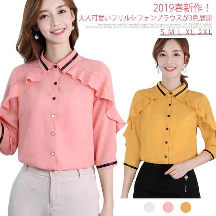 《送料無料》3色選べる!フリルシフォンブラウス シャツ ブラウス レディース 長袖 シフォントップス シフォンブラウス シフォンシャツ フリル 配色ライン 春 夏 新作