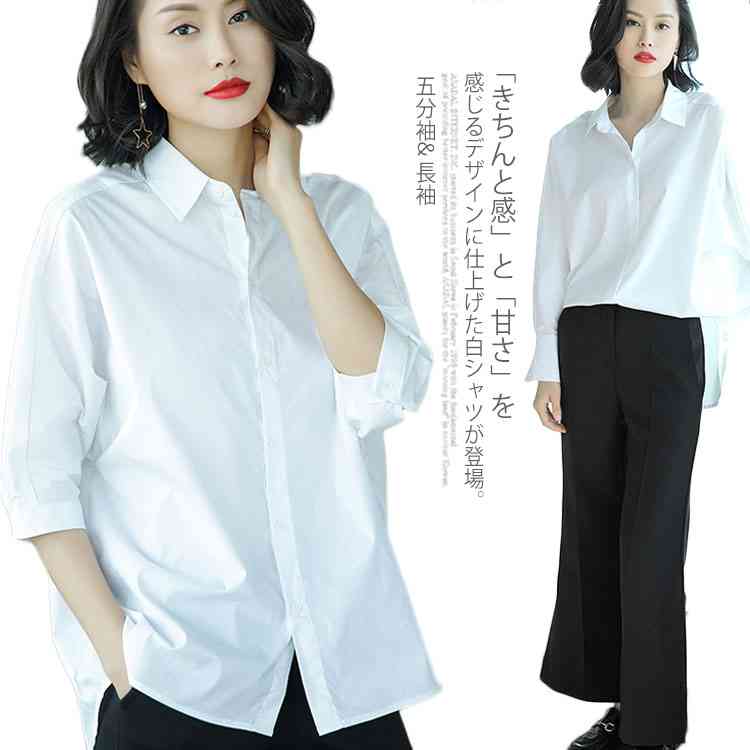 《送料無料》[五分袖/長袖]シャツ 白 綿混 長袖シャツ ブラウス レディース レディースシャツ ロング 白シャツ 春シャツ 大きサイズ ゆったり 長袖 5分袖 春 夏 ベーシック 無地 ホワイト