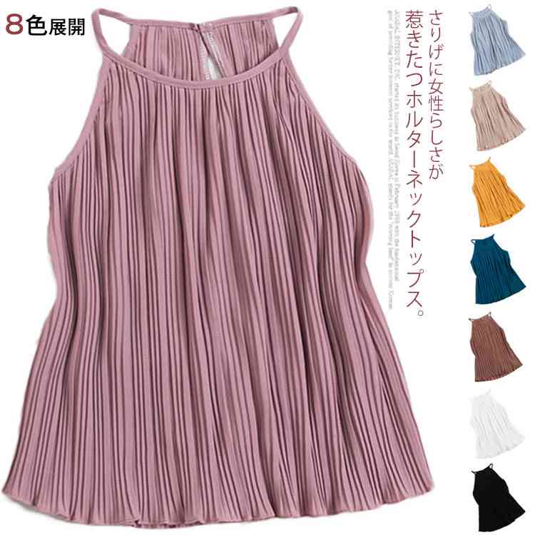 《送料無料》春色追加全8color!プリーツ加工 トップス ホルターネック ブラウス ノースリーブ プリーツブラウス キャミソール タンクトップ シフォン 夏服 シンプル 無地 おしゃれ 可愛い